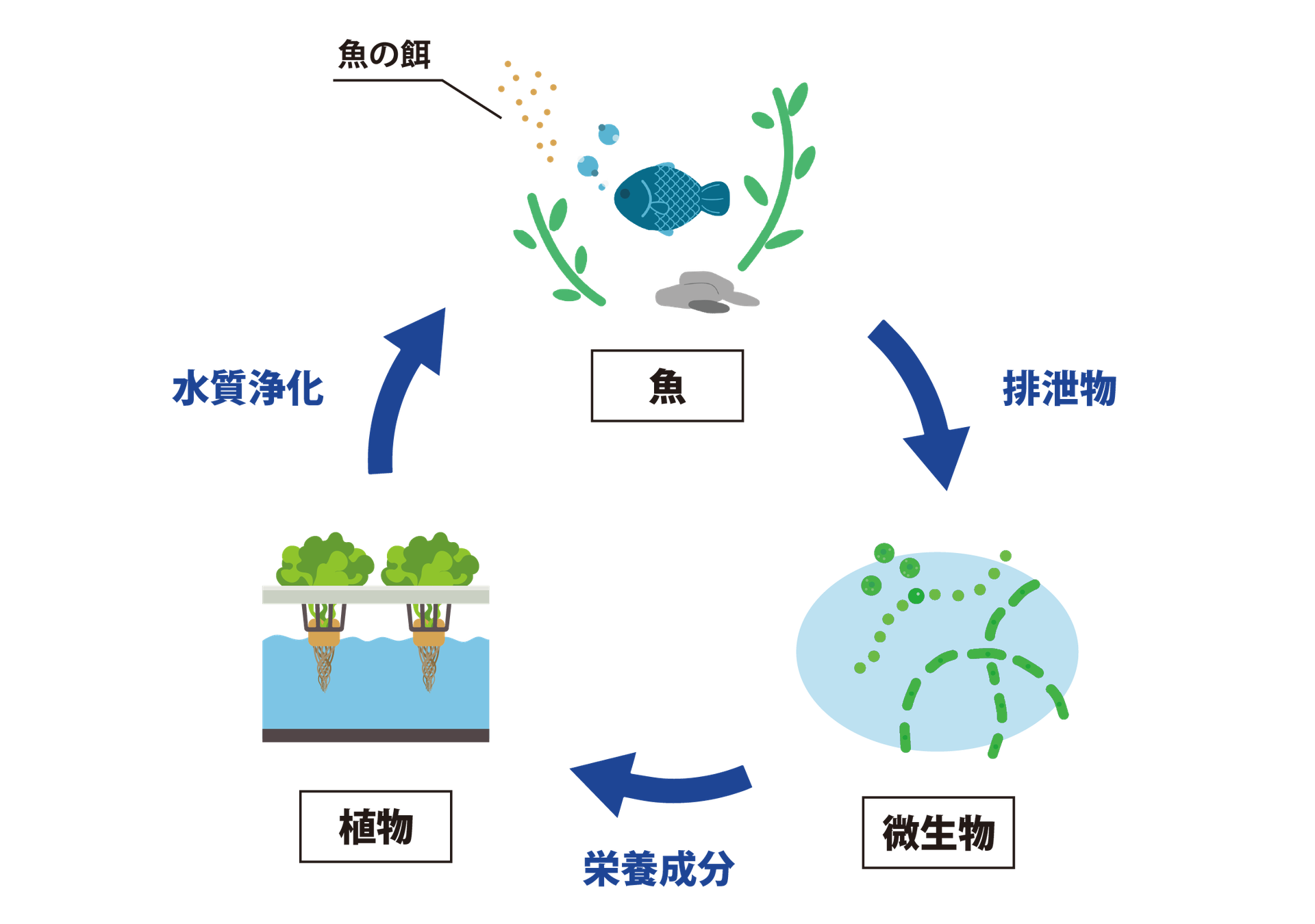 水産養殖(Aquaculture)と水耕栽培(Hydroponics)を組み合わせた次世代型の循環型農業です。魚の排泄物を微生物が分解し、植物がそれを栄養として吸収、浄化された水が再び魚の水槽へと戻る、生産性と環境配慮の両立ができる生産システムです。