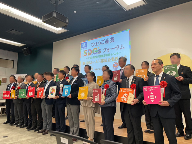 また、2025年1月22日には、「ひょうご産業SDGs推進宣言事業・認証事業」におけるゴールドステージ認証企業として、「ひょうご産業SDGsフォーラム」(大阪・関西万博開幕直前イベント内)の授与式に出席しました。当社を含む10社が認証され、兵庫県知事より記念盾を授与されました。