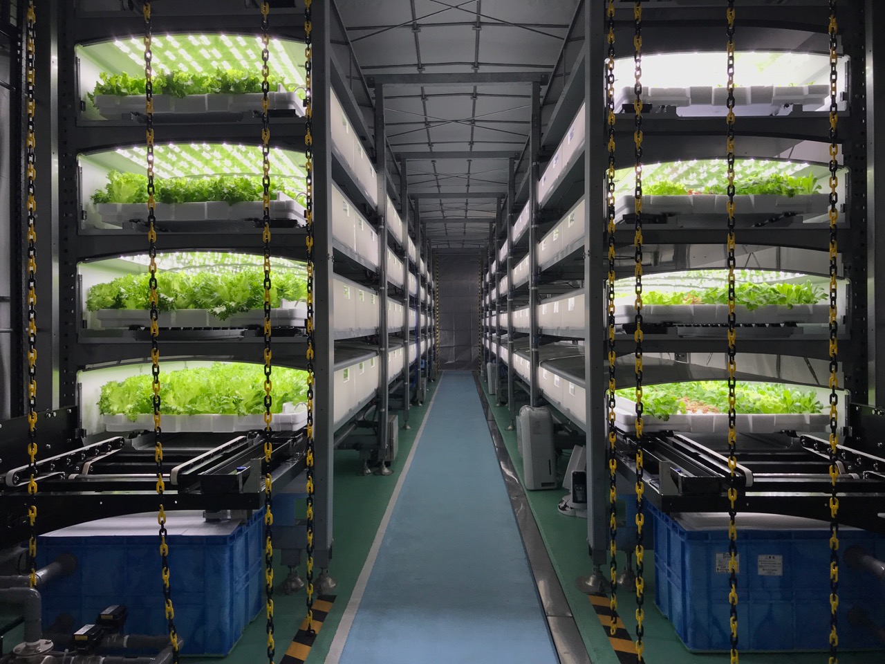 その中の水耕栽培棚に当社の植物工場事業で培った搬送システムが採用されています。