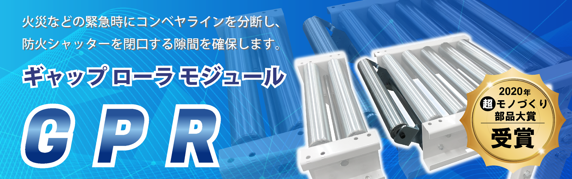 防火区画対応モジュール「GPR」をご紹介! 動画が視聴できない場合は こちら をクリックしてください。 防火区画対応のGPR(ギャップローラーモジュール)は、火災などの緊急事態にコンベヤラインを分断し、防火シャッターを閉口する隙間を確保する事で、延焼防止効果を発揮する事ができます。近年、大規模な倉庫火災が発生している事もあり注目されている商品です。また、空気圧を使うコンプレッサー式に比べ、エア配管が不要でメンテナンスが容易であることが評価され、2020年には『超モノづくり部品大賞』を受賞しました。