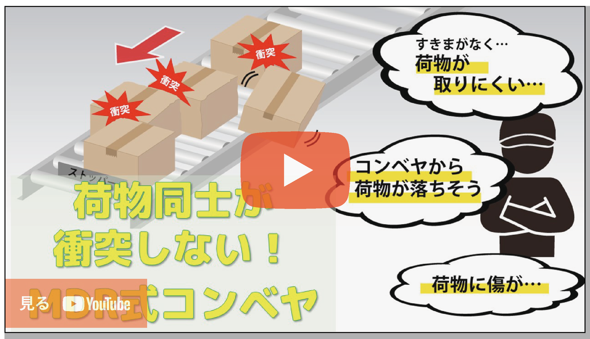 荷物に傷がつかないコンベヤ 動画が視聴できない場合は こちら をクリックしてください。 他方式のコンベヤでは、エアー駆動によるストッパーで当てて止め、後方からの製品や荷物は衝突しながら止められます。荷物も詰まってしまい取り難く作業性が悪くなります。 コンベヤから荷物が落ちてしまう事も…。MDR式コンべヤは、そのような時でも、ぶつからずに間隔を空けて止まり、荷物を傷つけることなく、安定した作業が行えます。