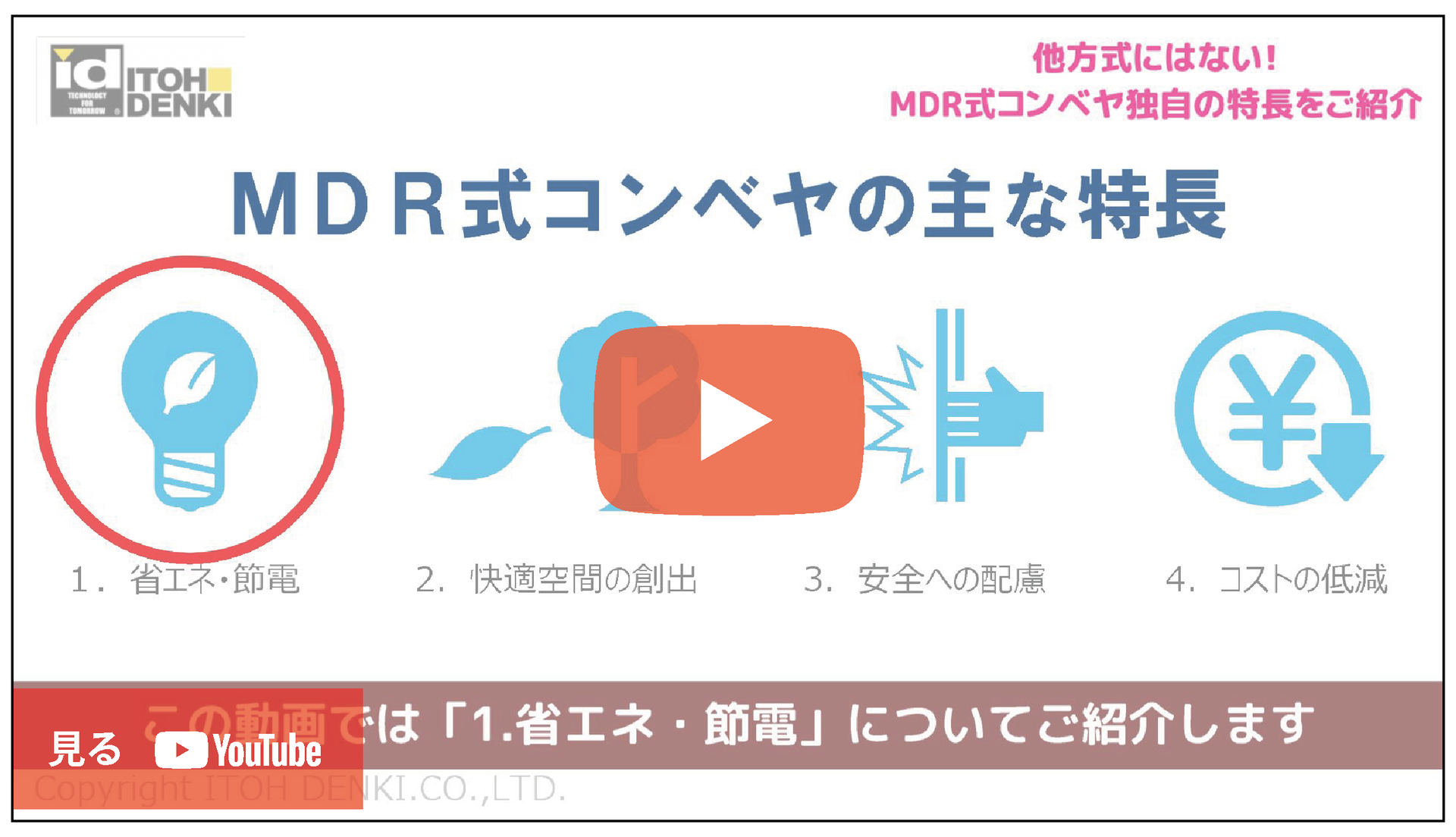 他方式にはないMDR式コンベヤの独自の特長をご紹介 動画が視聴できない場合は こちら をクリックしてください。 伊東電機のコア技術である「MDR」は物流倉庫や製造現場で大活躍している製品です。 本日は他方式コンベヤとMDR式コンベヤを比較しながら、独自の特長を4つの項目に分けてご紹介いたします。この動画では、第1弾として「[1]省エネ・節電」の項目についてご説明いたします。
