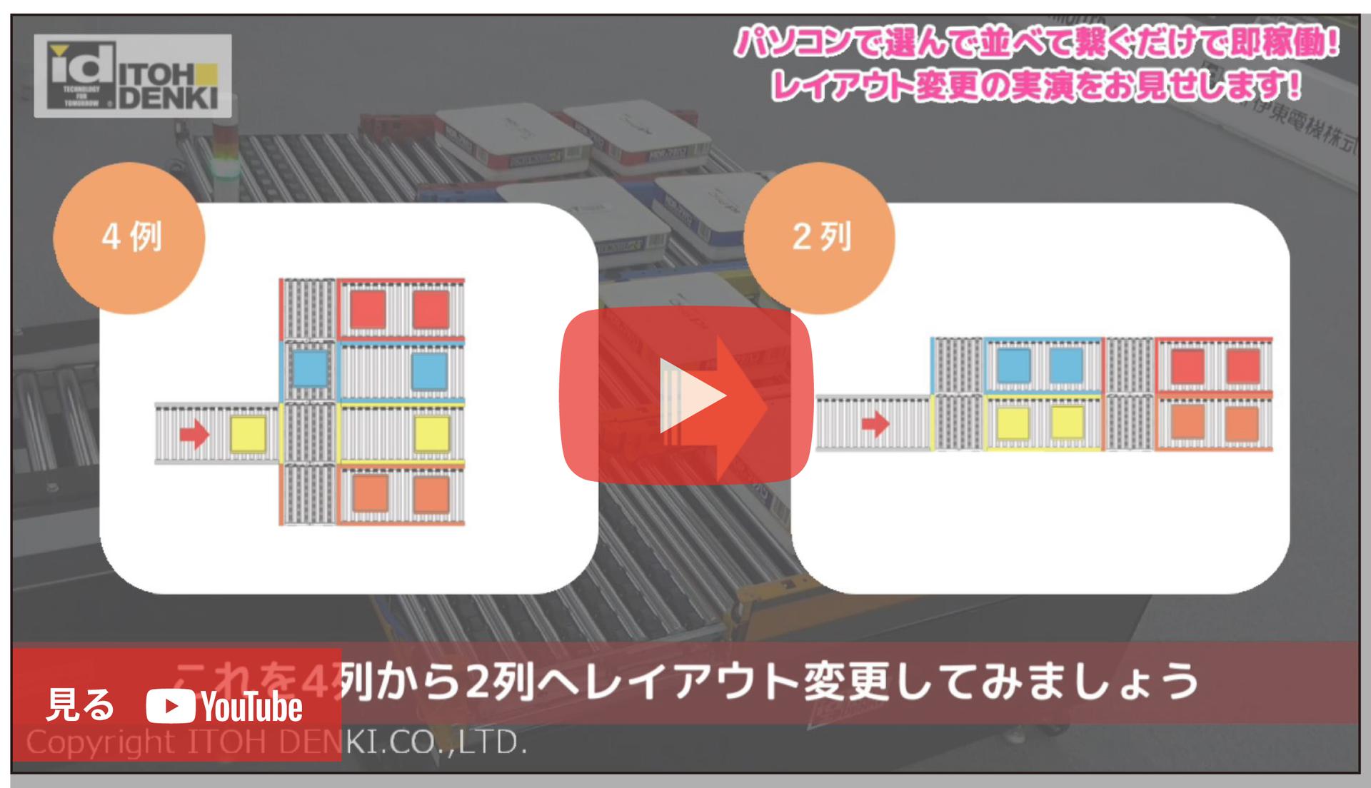 選んで並べて繋ぐだけで即稼働!レイアウト変更の実演をお見せします! 動画が視聴できない場合は MDR式マテハン”id-PAC”とは、MDR式モジュールをブロックの様につなぎ、簡単にフレキシブルに自動化ラインを構築する技術です。本日はパソコンで選んで並べて繋ぐだけで即稼働できるレイアウト変更の実演をご紹介します。