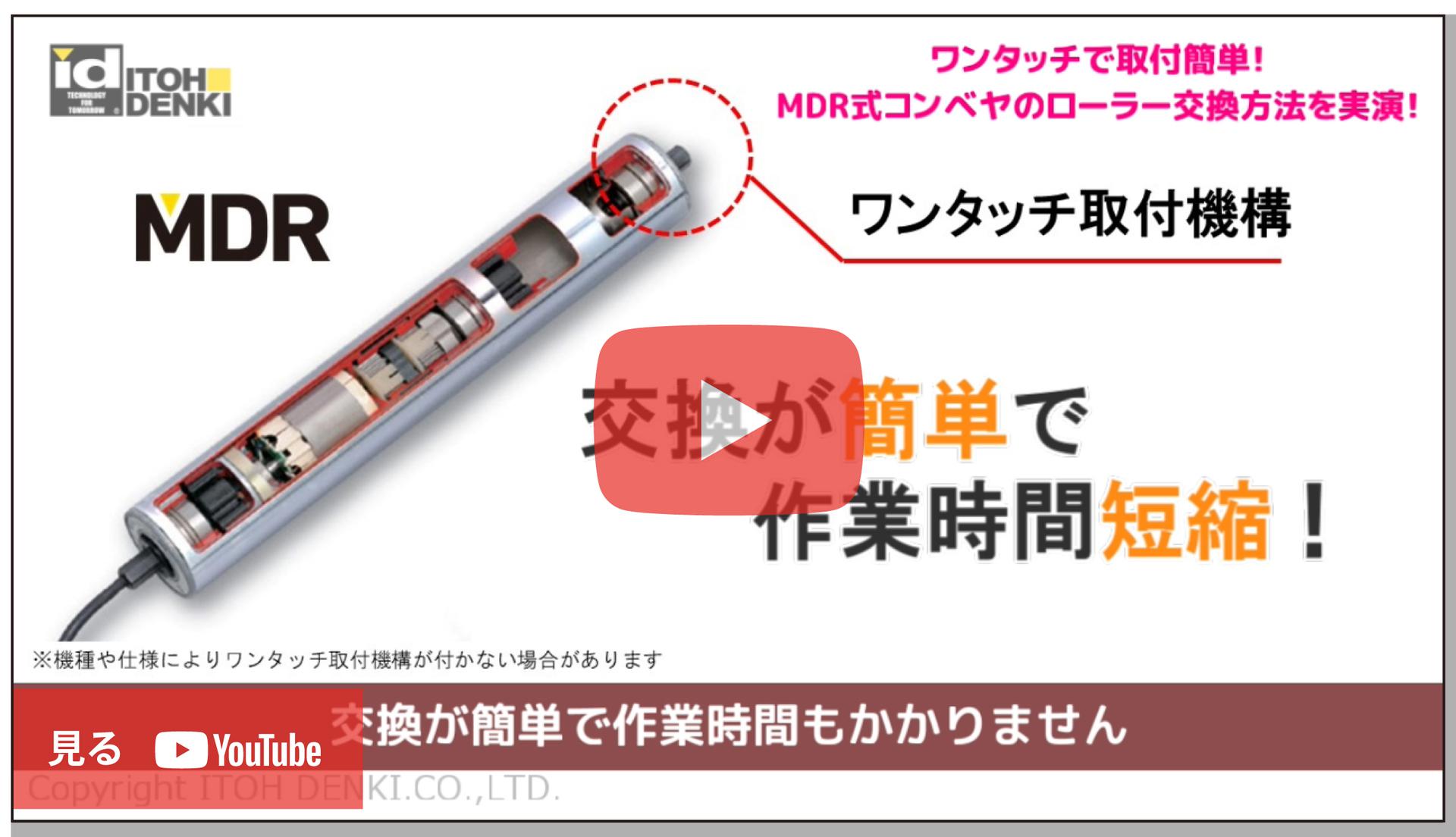 MDR式コンベヤのローラー交換方法を実演! 動画が視聴できない場合は こちら をクリックしてください。 予期せぬ故障に即交換対応が求められることがあるのではないでしょうか? MDR式コンベヤのローラーは、「ワンタッチ取付機構」で誰でも簡単にローラーの交換をする事ができます! この動画ではローラーの交換方法を実演を交えてご紹介します。