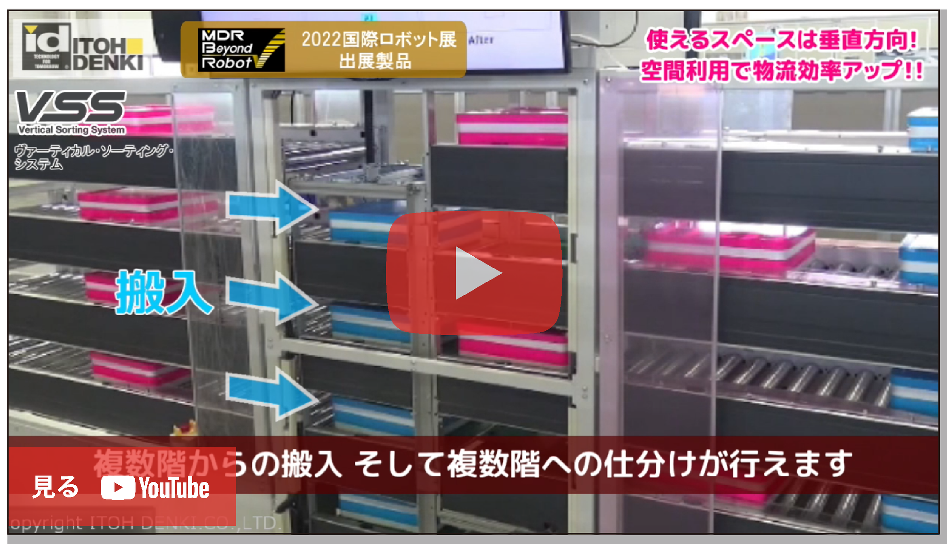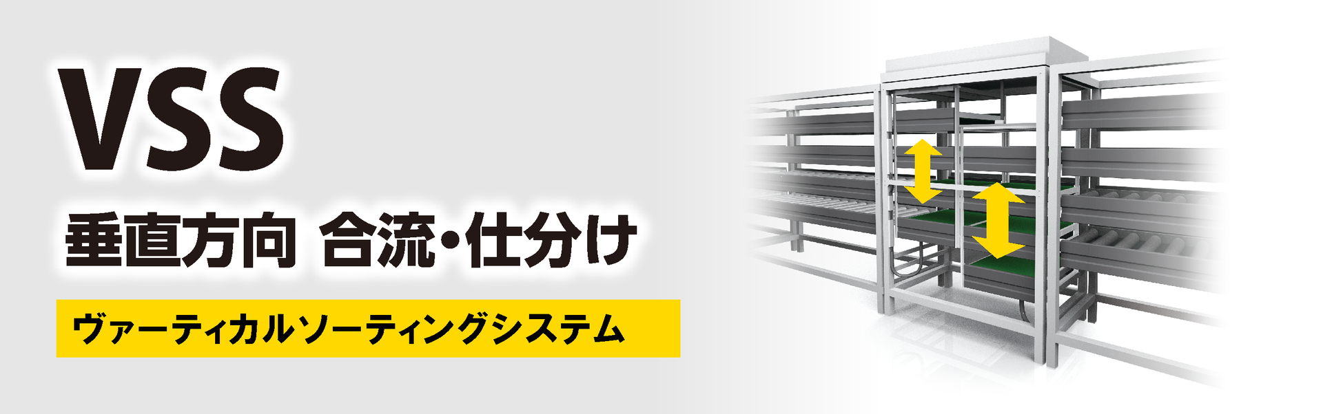 垂直方向への合流仕分けシステム「VSS:ヴァーティカル・ソーティング・システム」 動画が視聴できない場合は こちら をクリックしてください。 取扱品目が増える中、限られたスペース・面積で自動化し、生産性を高め利益を生み出す事が物流の課題です。 VSS(ヴァーティカル・ソーティング・システム)は、垂直方向へ高速仕分けを行います。 昇降した後に、搬送物を載せるカゴが戻ってくる時間を待つ必要がなく連続した上下動アクションで垂直方向の空間を活用した合流・仕分けが行えます。