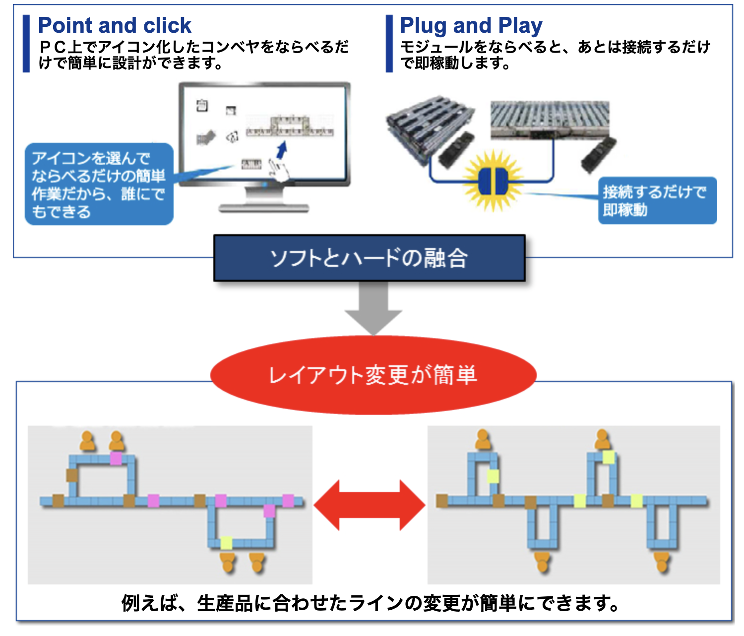 PC上でアイコン化したコンベヤを並べるだけで設計完了。モジュールを並べて接続するだけで即稼働