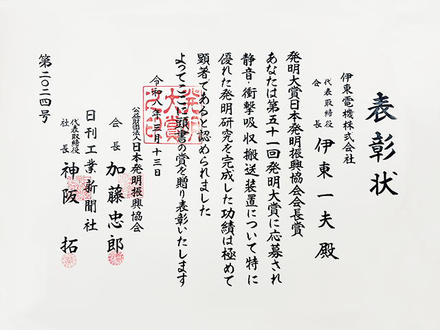 「第51回 発明大賞」では、当社製品の小物・軟包装品の搬送に最適【フレキシブルノイズレスローラ FNR】が「日本発明振興協会会長賞」を受賞しました。