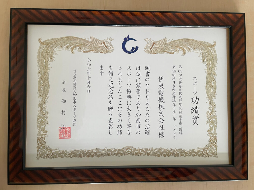 このたび伊東電機野球部は、加西市スポーツ協会の「スポーツ功績賞」を受賞しました。(10月6日付)
