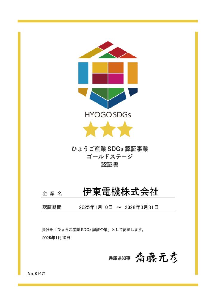 伊東電機はこの度、「ひょうご産業SDGs推進宣言事業・認証事業」のゴールドステージ企業に認定されました。(2025年1月10日付)