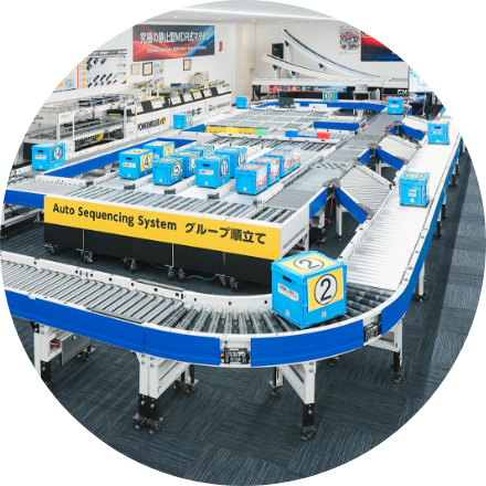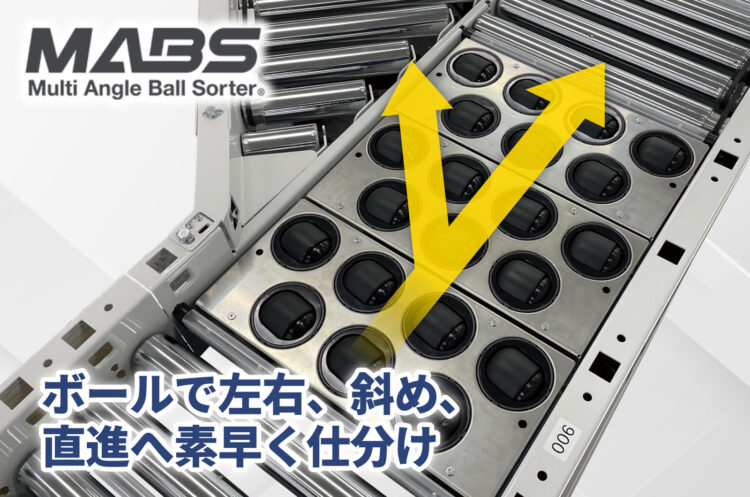 MABS(マルチアングルボールソーター)は、仕分け用のボールが任意の角度で回転し、搬送物を素早く、左右、斜め、直進へと仕分けるコンベヤモジュールです。