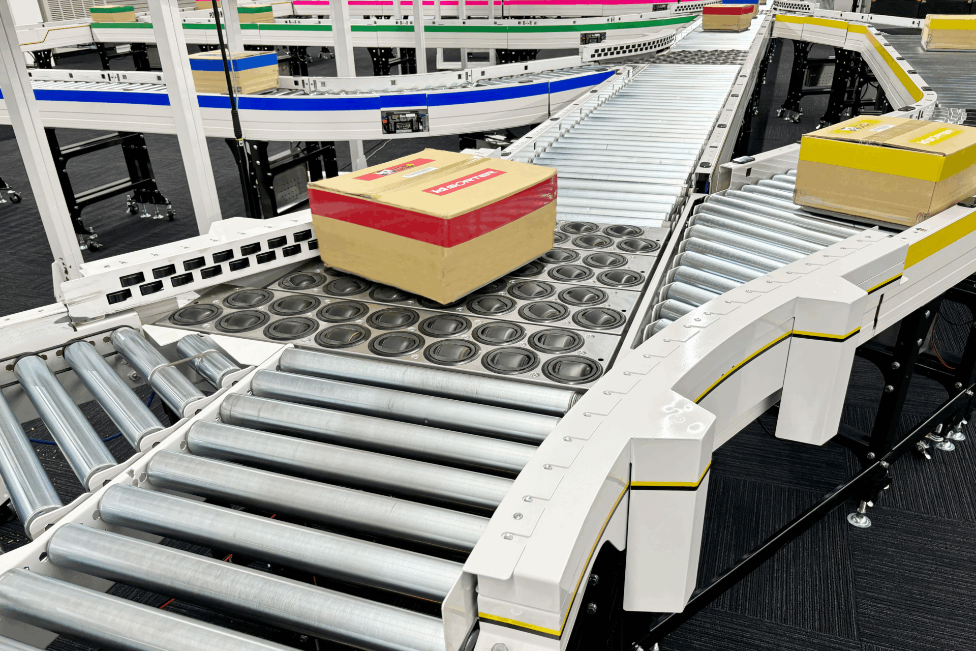 MABS(マルチアングルボールソーター)は、仕分け用のボールが任意の角度で回転し、搬送物を素早く、左右、斜め、直進へと仕分けるコンベアモジュールです。