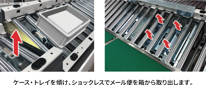 ケース・トレイを傾け、ショックレスでメール便を箱から取り出すMDR駆動のエアーレスモジュール。箱出し動作も優しく行います。 -