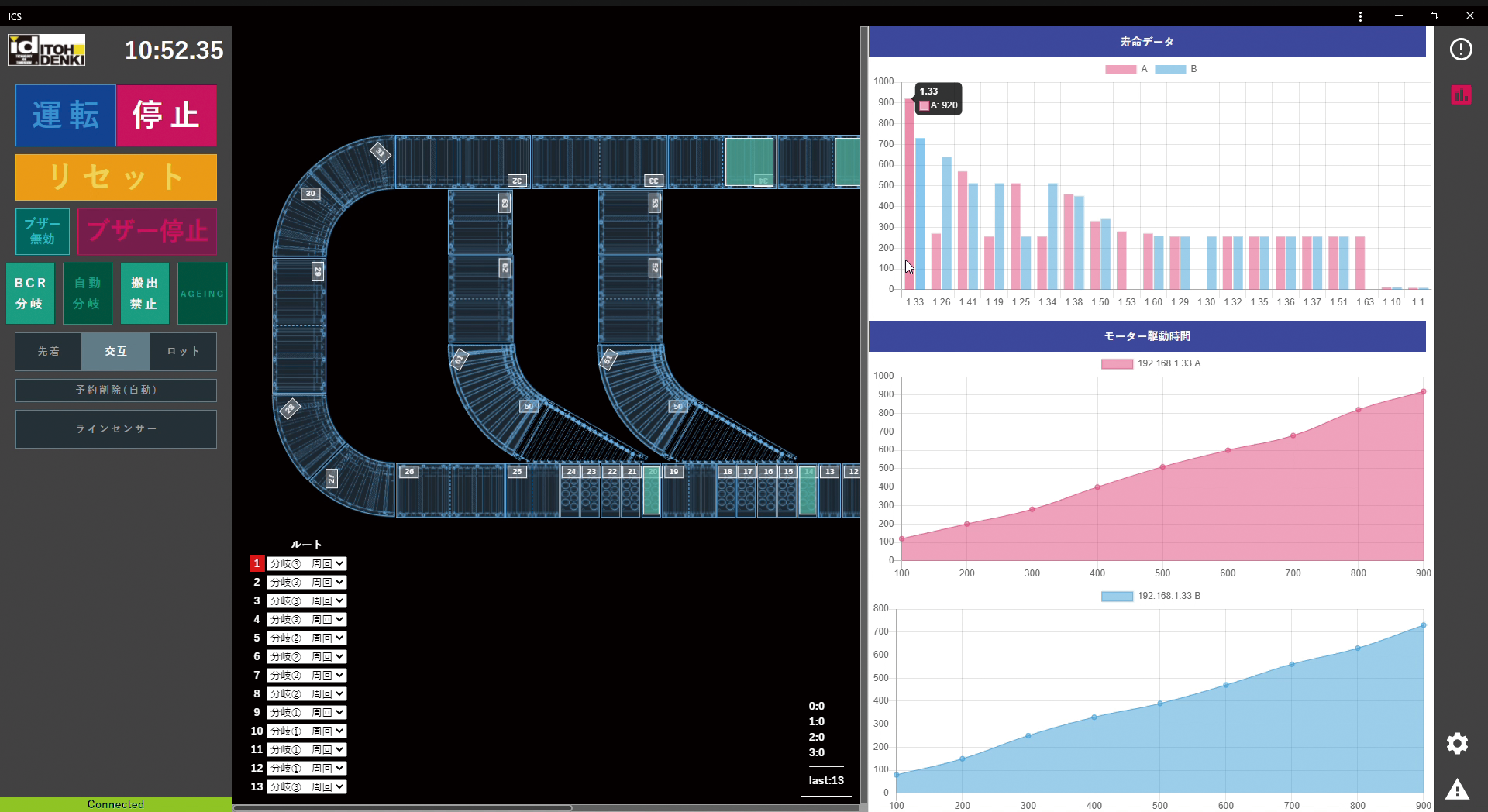 搬送物の位置や動き、スループット、エラー情報、MDRの寿命まで、リアルタイムで追跡しており、パーフェクトな搬送・仕分けを実現する伊東電機の独自技術です。