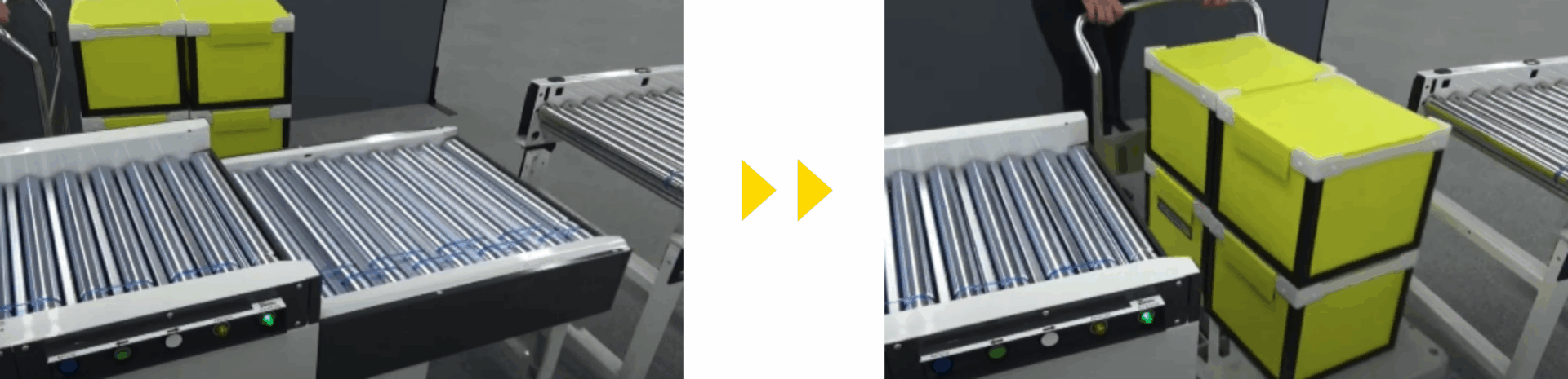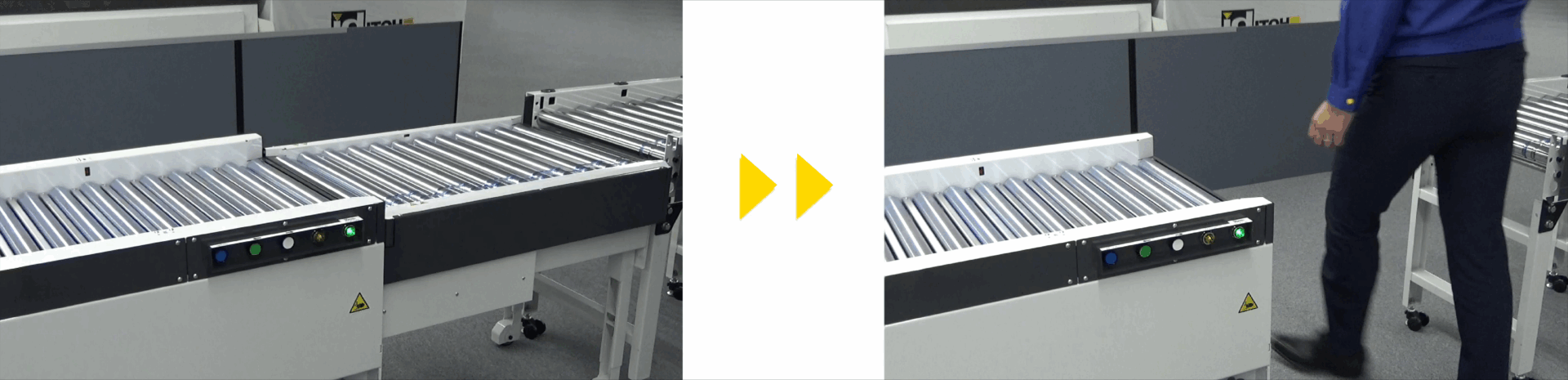 動作は、オープンスイッチの押下でゲートコンベヤが下降し、ベースコンベヤ下部に収納される仕組みで、自動開閉時間はPCLで設定可能。快適な作業環境と省スペース化を両立し、安全・楽々・軽々に現場の導線を確保します。