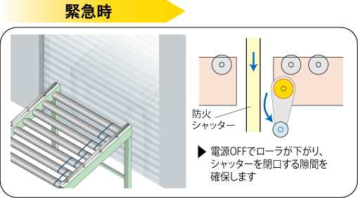 電源OFFでローラが下がり、シャッターを閉口する隙間を確保します。通電でローラが上昇し、電源遮断でローラが下降します。既設コンベヤへの取付も簡単です。