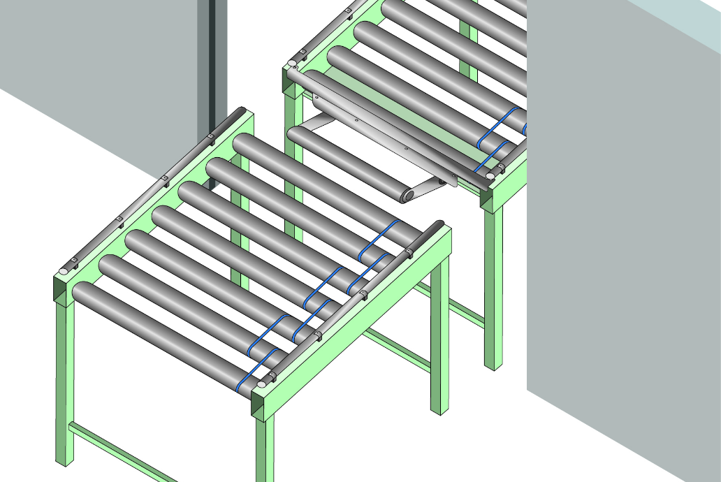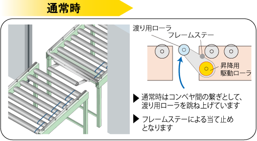 通常時はコンベヤ間の繋ぎとして、渡り用ローラを跳ね上げています。渡り用ローラがコンベヤ間の隙間を少なくし、搬送物の落下防止にも繋がります。