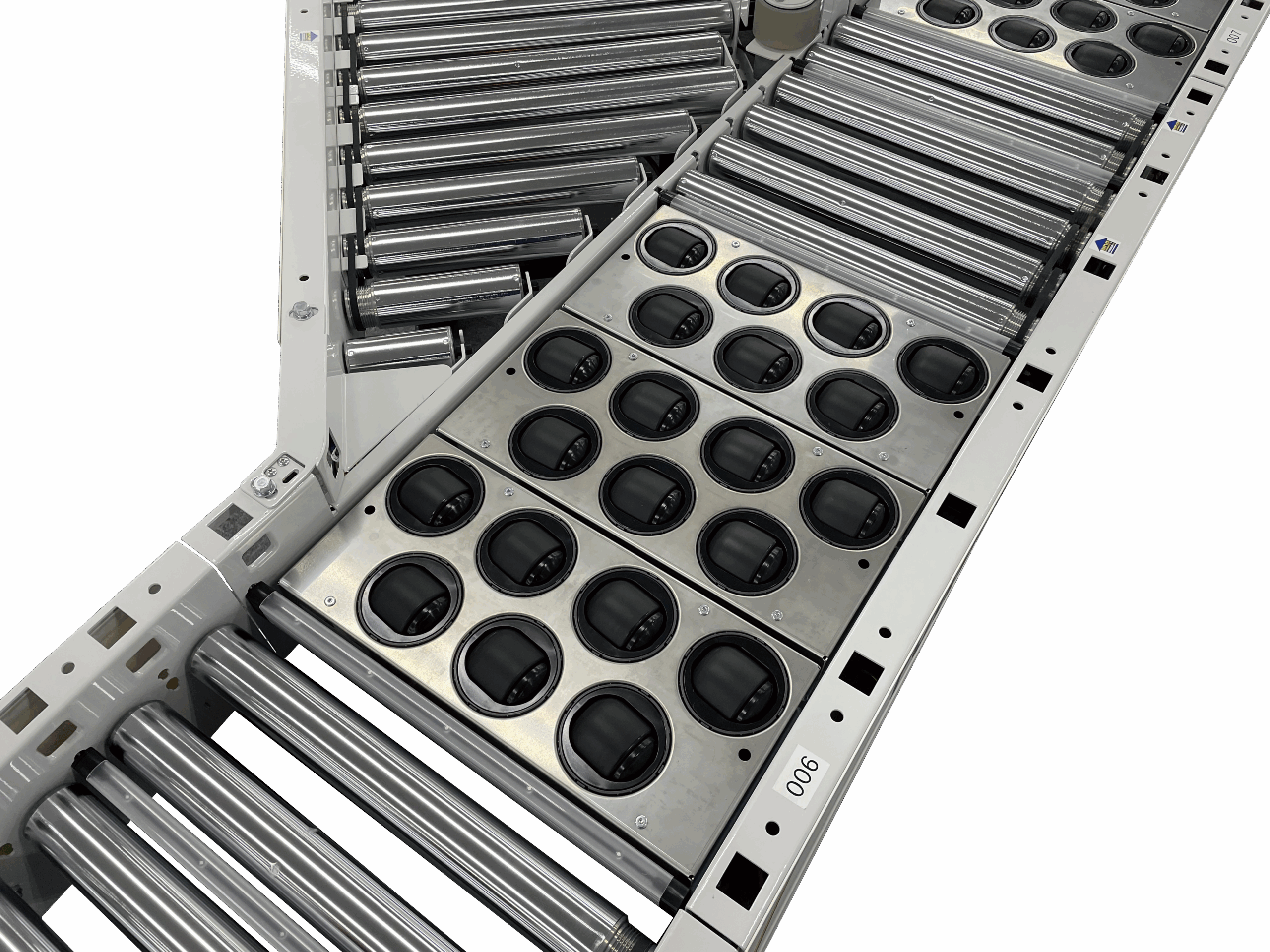ボール状のローラーが任意の角度で回転。仕分け方向を自由に、柔軟に設定できる分岐モジュールです。