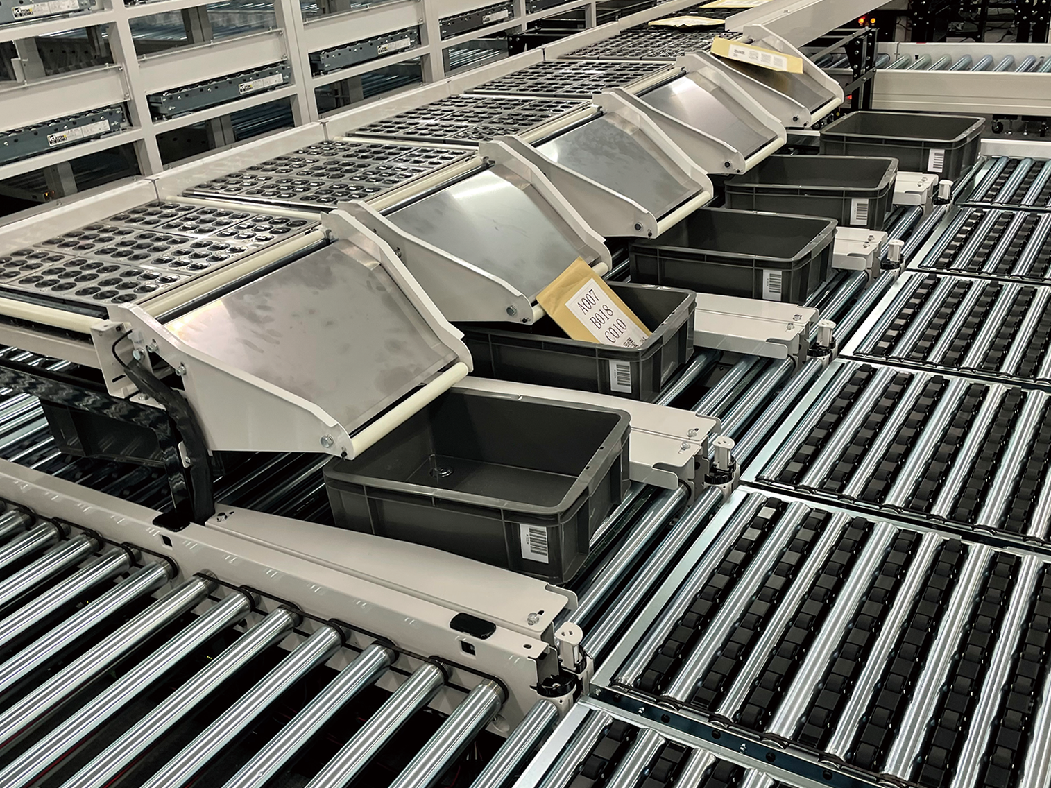 独自開発の衝撃吸収ローラ「フレキシブル・ノイズレス・ローラ」と小物・袋物対応の仕分け装置「フレキシブル・ノイズレス・ソーター」を組み合わせ、方面別仕分けを効率アップさせる為の子備仕分けを実現。