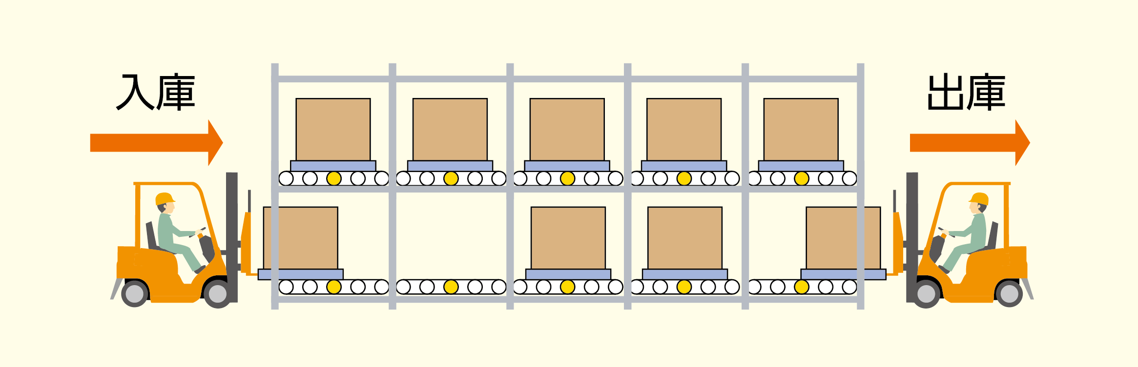 パレットの移動は1ゾーン毎の個別駆動となっているため、入庫と出庫の作業を同時に行えます。