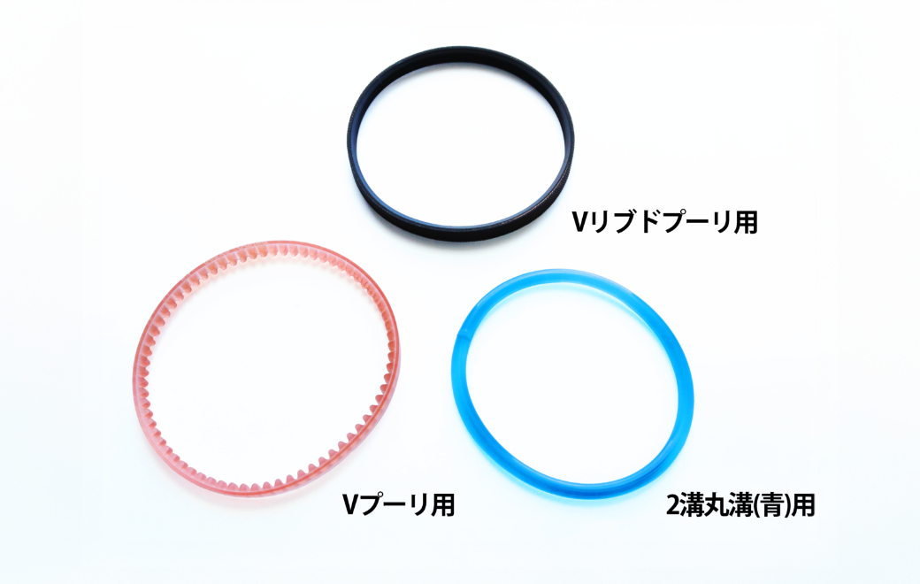 | Vリブドプーリ仕様 | Vプーリ仕様 | 2溝丸溝パイプ仕様 ベルトHT(青)タイプ | 2溝丸溝パイプ仕様 ベルトGUR(緑)タイプ | ||