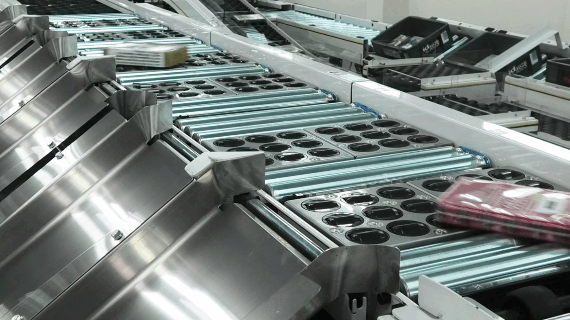 独自の衝撃吸収ローラを分散駆動させ整列搬送が行えます。EC物流で増える小物・軟包装品に最適なモジュールです。 -