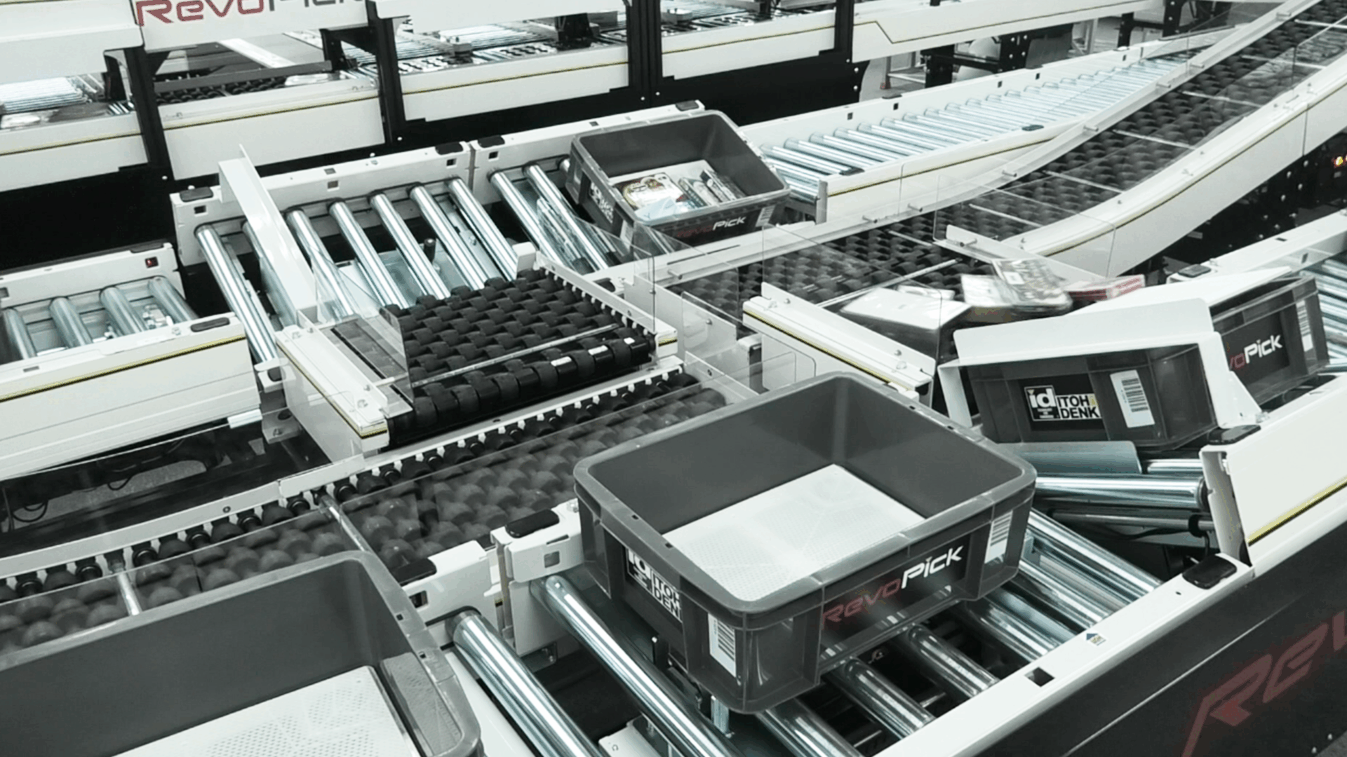 入荷した商品をケース・トレイ傾けモジュールと突き上げモジュールで取出し、フレキシブルノイズレスローラで、重なり合った商品をばらして整列させ、スキャンします。作業効率アップ。