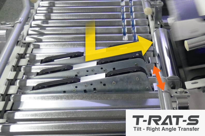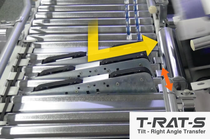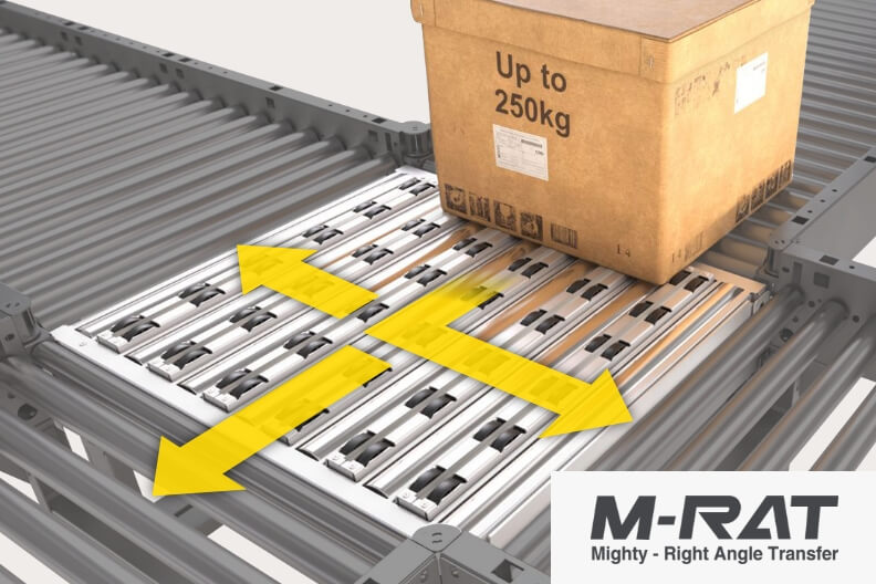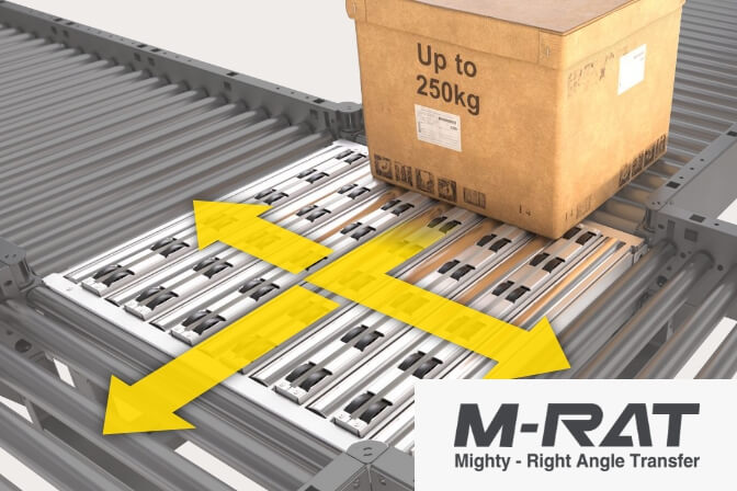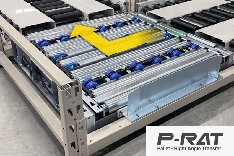 油圧、空圧機器を使用せずMDRで1,000kgのパレットを直角分岐する「P-RAT」とターンテーブルモジュールを搭載したコンベヤです。