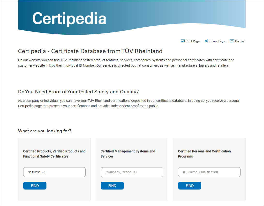 下記URLよりTUV_Rheinlandによる認証情報が確認できます。