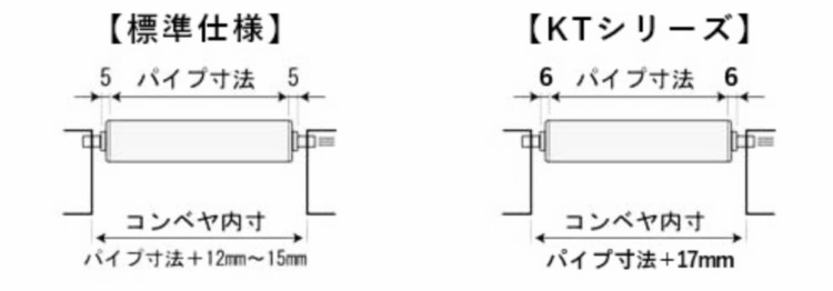 パワーモーラを適切に使用するためには、コンベヤフレーム内寸とパワーモーラの間に2mm-5mm(パイプ寸法を基準とする場合は12mm~15mm)の隙間が必要です。 KTシリーズに関しては17mmの隙間が必要です。